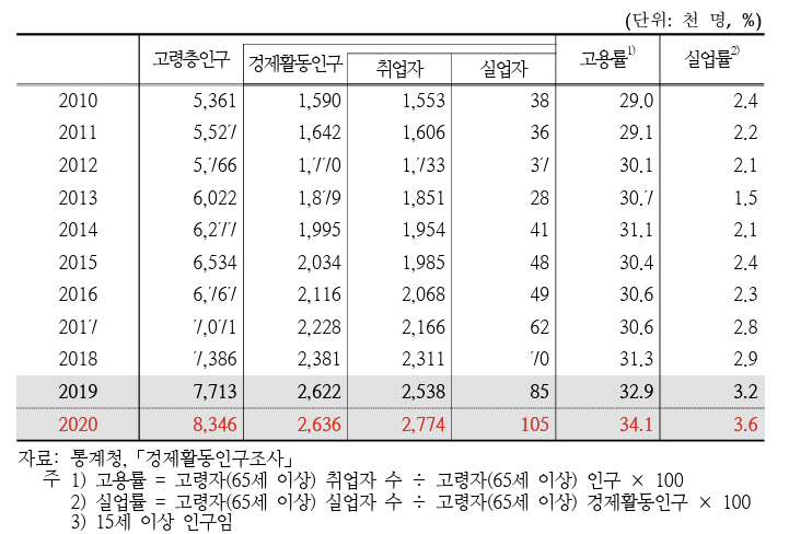 • 통계청(2021)의 자료에 따르면 우리나라 65세 이상 노인의 고용률은 평균 34.1%로 OECD 평균(14.9%)에 비해 2배 이상 높은 수준으로 OECD에서 한국은 2위로 높은 것 으로 나타났다.
