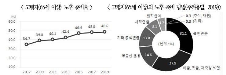 - 2019년 65세 이상 고령자의 48.6%는 본인의 노후 준비를 하고 있거나 준비가 되어 있 으며, 그 비중은 남자(60.9%)가 여자(39.3%)보다 높다.