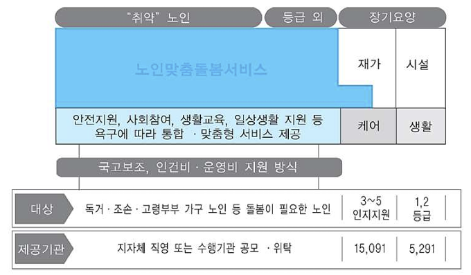 - 이러한 한계를 극복하고, 건강한 노화(healthy aging), 지역사회 계속 거주(aging in place), 장기요양·요양병원 등 고비용 돌봄 진입 예방을 위한 예방적 돌봄 강화를 위해 노인맞춤돌봄서비스가 등장